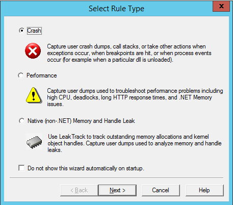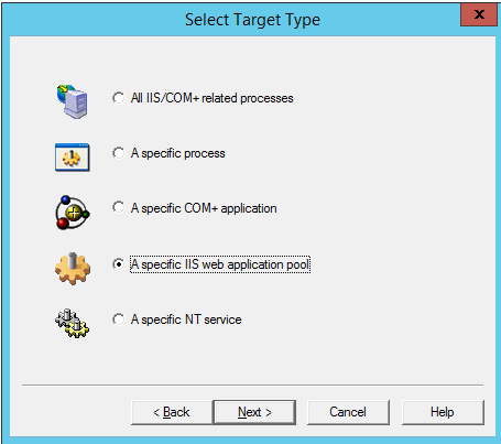 3. As I am capturing dump from a SharePoint web application I will choose “A specific IIS web application pool” and click Next. For Timer Services I would choose a specific NT service and then SharePoint Timer Service.