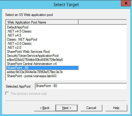 4. Then I will choose the application pool for the web application I want to capture the process dump (you can find the application pool name associated with the in Central Administration / Manage Web Applications) then click Next