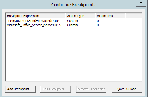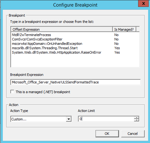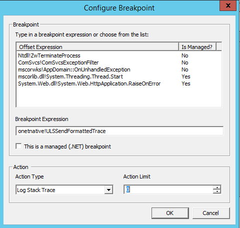 15. Enter Microsoft_Office_Server_Native!ULSSendFormattedTrace as Breakpoint Expression and Action Limit to 0 (no limit).