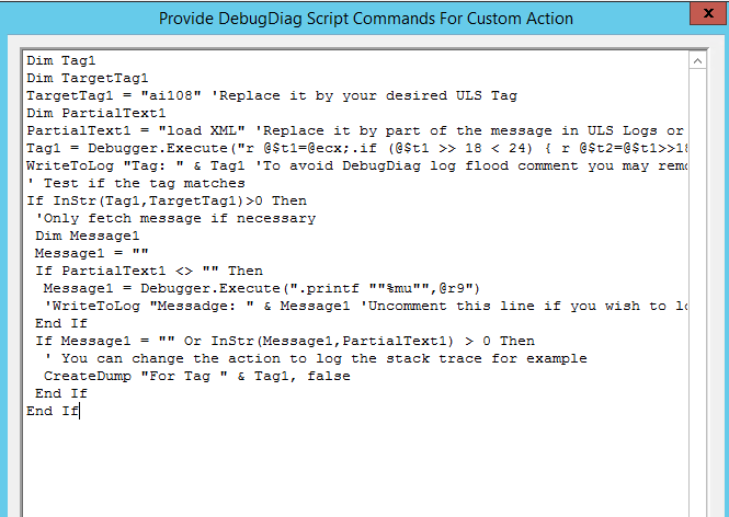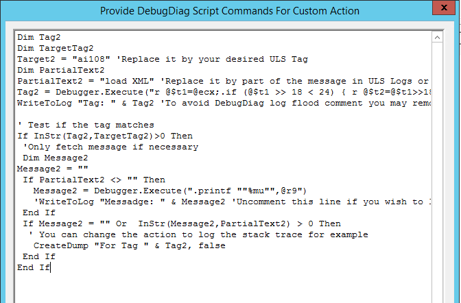 Dim Tag1Dim TargetTag1TargetTag1 = "ai108" 'Replace it by your desired ULS TagDim PartialText1PartialText1 = "load XML" 'Replace it by part of the message in ULS Logs or make it "" for all messagesTag1 = Debugger.Execute("r @$t1=@ecx;.if (@$t1 >> 18 < 24) { r @$t2=@$t1>>18 & 3f; r @$t3=@$t1>>12 & 3f; r@$t4=@$t1>>0c & 3f; r @$t5=@$t1>>6 & 3f;r @$t6=@$t1 & 3f;.printf ""%C%C%C%C%C"",@@c++(@$t2 > 0x19 ? @$t2 + 0x16 : @$t2+'a'),@@c++(@$t3 > 0x19 ? @$t3 + 0x16 : @$t3+'a'),@@c++(@$t4 > 0x19 ? @$t4 + 0x16 : @$t4+'a'),@@c++(@$t5 > 0x19 ? @$t5 + 0x16 : @$t5+'a'),@@c++(@$t6 > 0x19 ? @$t6 + 0x16 : @$t6+'a');} .else { .printf ""%C%C%C%C"", @$t1>>18,@$t1>>10,@$t1>>8,@$t1; };")WriteToLog "Tag: " & Tag1 'To avoid DebugDiag log flood comment you may remove this line' Test if the tag matchesIf InStr(Tag1,TargetTag1)>0 Then'Only fetch message if necessaryDim Message1Message1 = ""If PartialText1 <> "" ThenMessage1 = Debugger.Execute(".printf ""%mu"",@r9")'WriteToLog "Messadge: " & Message1 'Uncomment this line if you wish to log the messageEnd IfIf Message1 = "" Or InStr(Message1,PartialText1) > 0 Then' You can change the action to log the stack trace for exampleCreateDump "For Tag " & Tag1, falseEnd IfEnd If
