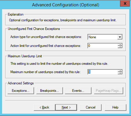 5. On Advanced Configuration, I will limit the number of dumps created by the rule to 1 (for a different requirement it can be a different number)