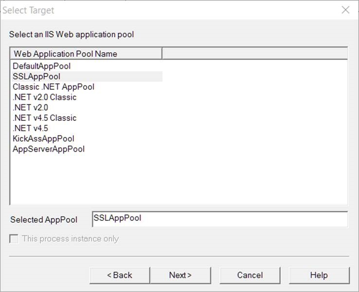 5. In the next window, choose the Application Pool you are having problem with (you will see different options in your environment) and click Next