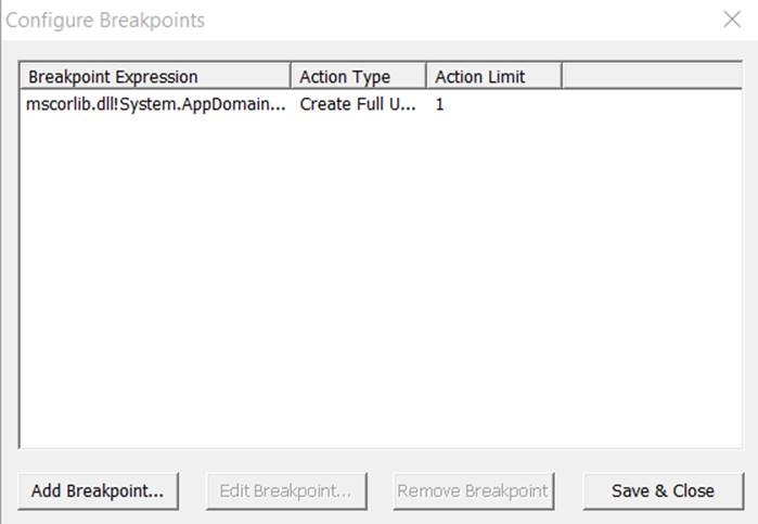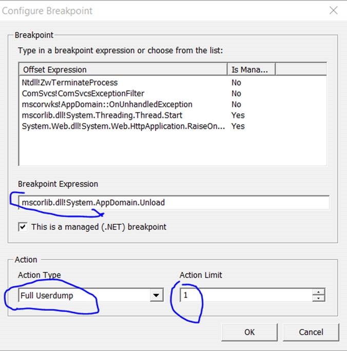 8. Type mscorlib.dll!System.AppDomain.Unload on Breakpoint Expression. Make sure This is a managed (.NET) breakpoint is selected.. Action Type is to be set to “Full Userdump” and action limit to be set to 1 and click Ok