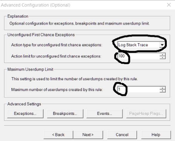 6. In “Action type for unconfigured…” choose Log Stack Trace. In “Action Limit”, write 100. In “Maximum number of userdumps…” choose 1 as below (do not click Next yet):