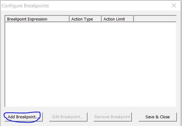 7. Click on the button Breakpoints. Click on Add Breakpoint…