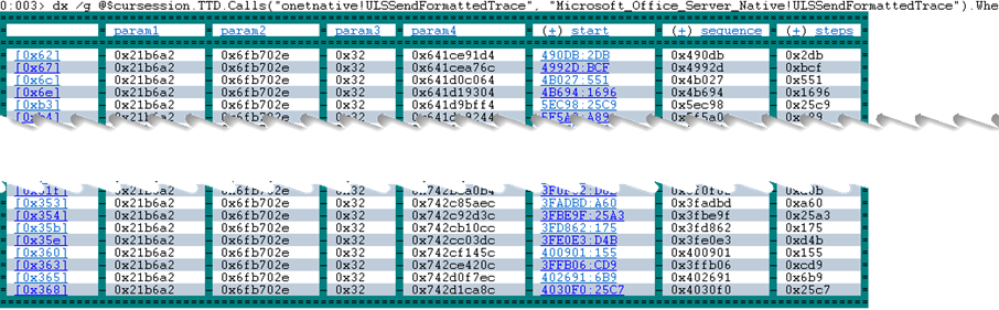 | dx /g @$cursession.TTD.Calls(“onetnative!ULSSendFormattedTrace”, “Microsoft_Office_Server_Native!ULSSendFormattedTrace”).Where(c => c.Parameters[0] == 0x21B6A2).Select(c=> new { param1 = c.Parameters[0], param2 = c.Parameters[1], param3 = c.Parameters[2], param4 = c.Parameters[3], start = c.TimeStart, sequence = c.TimeStart.Sequence, steps = c.TimeStart.Steps } ) |