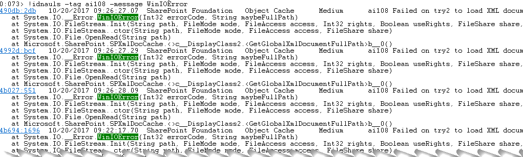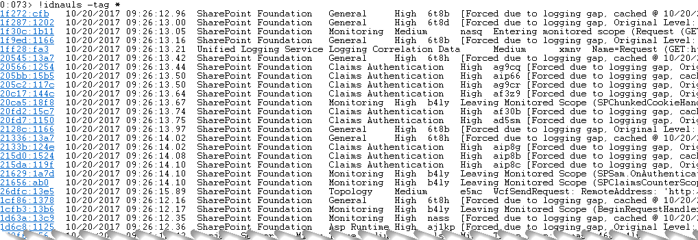 In my previous post, I showed a proof-of-concept script to list all occasions a process opened a file. JavaScript is easy to program and works for most cases, however in some occasions you need to access resources not available from JavaScript and only a full-fledged debugging extension will do. In this post I will show some highlights of a debugging extension using the new Time Travel Debugging and the new API which at the time of writing was still in preview and may change before final release. The extension contains some other commands as I wrote this for training purposes and decided to leave “as is”, so if you are also only interested in writing your extension, you can get some ideas from it. The command for Time Travel Trace (TTD) is “!idnauls”. The idea is to list all occasions when SharePoint logs something and show the time, event id (tag), TTD position, category, severity and message of the log entries. It can also filter by tag, category and message. The logic behind this is explained on a previous post. This command only works with TTD dumps (.run) and it requires the new debugging tool which is also in preview version. There is no need to use this extension for other end than learning. NetExt includes a similar command (!widnauls) for this purpose. Special thanks to Ken Sykes and Bill Messmer for the help with new API.