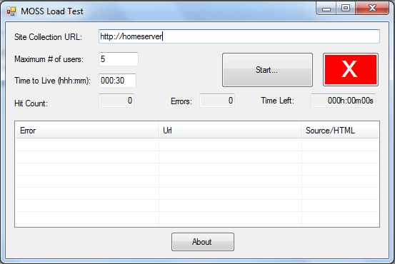 I had put together an application to perform Load Test in both Microsoft Office SharePoint Server (MOSS) 2007 and Windows SharePoint Services (WSS) 3.0. The application as it is now is more “Load” than “Test”. The next step will be to save the results in a database and enable live queries. I am planning to use the Jet Database (Access). I am releasing this intermediate version because if used with other tools it can complete the cycle. This can be used to test capacity problems before publishing a SharePoint portal.